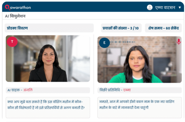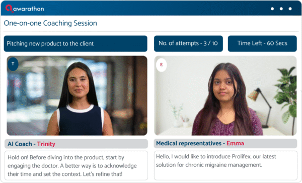 Healthcare organizations need their medical reps to be fully prepared when meeting doctors and presenting medicines. Awarathon, powered by AI coach Trinity, transforms training by combining personalized learning, realistic two-way AI simulations, and structured practice modules. Medical reps can practice probing, intent mapping, and objection handling in a safe, risk-free environment, gaining actionable insights from real-time AI feedback to refine every conversation.